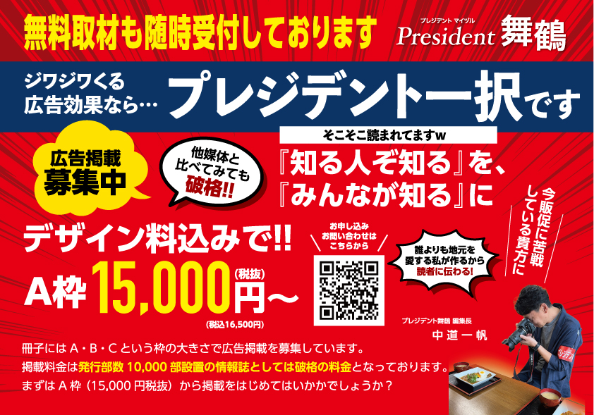 ぜひプレジデント舞鶴に取材に来て欲しい、と興味がある方は下記までお問い合わせください。